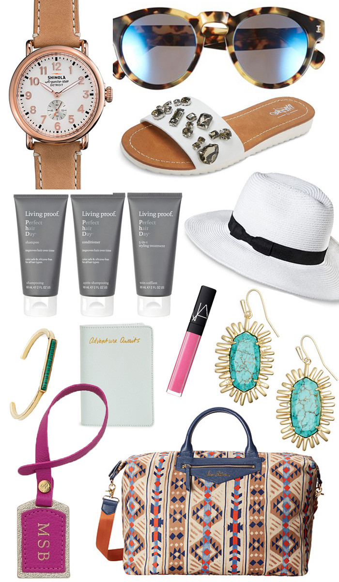 Chic Travel Must Haves June 24, 2015 | Towards the end of June I always start getting a travel bug. Like bad. It’s hot outside and my social media feeds are jam packed with people on beautiful vacations and I admittedly start getting the itch to get outta dodge. Thankfully, we planned a last minute beach trip for next week, so I am already counting down. Since all I want to do is throw all of my things in a duffle bag and skip town, I rounded up my favorite travel essentials for you guys! *Board is shoppable by simply clicking on the item that you’d like more information on, you’ll then be taken directly to that product page… < > Love the neutral band and casual look of THIS Shinola Watch Reflective sunnies are the next big thing, and the tortoise rim on THESE makes for a super chic look THESE jeweled sandals are under $25 and I wear mine ALL.OF.THE.TIME Talked about my Living Proof hair products on Insta, but seriously if you want no frizz, you must try THIS affordable panama hat was an impulse buy that turned into true love. I won’t cry if Landry throws it in the pool (like she’s done with multiple others) but love the overall fit and shape. THIS malachite bangle is perfect for summer stacking. Make your passport situation prettier with THIS passport cover Everyone needs a bright pink gloss in their travel bag and THIS is my favorite color Cannot get enough of THESE turquoise earrings for summer. They work as a neutral with summer whites. Make sure your bag stands out at baggage claim with THIS beautiful luggage tag We all need THIS bag, right? I can’t stop thinking about it. Where are you guys off to this summer?? Do share! testing stringtesting string